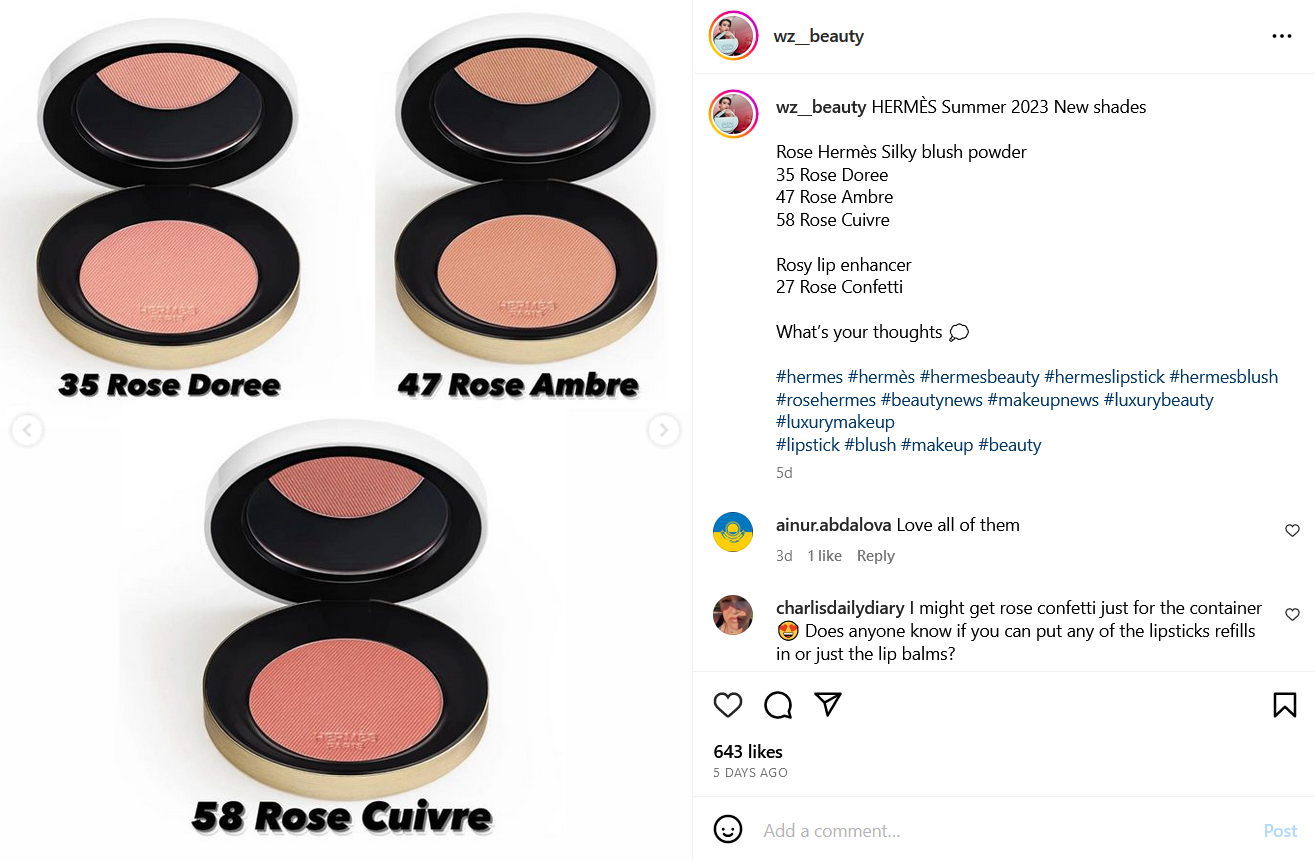 I like the Rose Feu matte blush I own from Hermes, but the fact that I barely use it was a strong enough reason for me to consider banning myself from buying more. However, the moment I learned that these additional shades had an “iridescent finish,” and that the Rose Cuivre shade has gold shimmer, instead of silver as I feared, my interest grew exponentially.