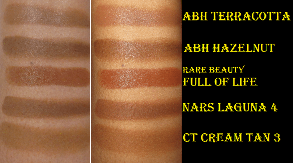 My original review for this is here, though I mentioned that I thought all my blending issues might be solved if I had a better shade for me. Eventually, ABH added three more to the line: Warm Tan, Terracotta, and Deep Tan. Terracotta and Deep Tan are similar depths and listed as being suited for tan to deep skin tones with the former having “warm red undertones” and the latter with “neutral” undertones. At the time, I owned a lot of deep bronzers that leaned neutral or cool and were so deep that they looked like contours on me. So, I chose Terracotta to guarantee I’d have something warm, even though red leaning bronzers aren’t my preference as much currently.