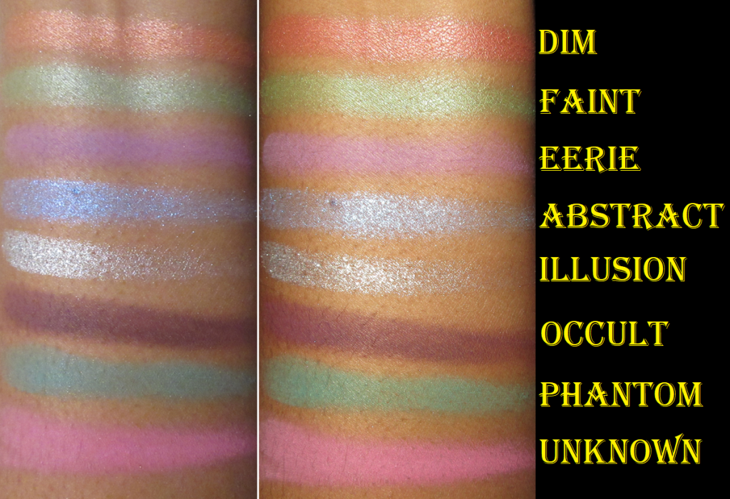 I’m a big fan of the “muted” nature of Eerie, Phantom, and Unknown because they give me a pastel affect without the ashy white cast that makes the majority of true pastel shadows look awful on my eyes. Occult, Phantom, and Unknown are easy to build up and blend easily with each other. Eerie takes more packing on than the others, but using the right primer can help. All the shadows performed well with the MAC Paint Pot, excluding Eerie (which took more effort and the final result was just okay), but I had an easier time using that shadow over my Coloured Raine Eye Base. These all perform well (minus the fallout issue with Illusion and to some degree Abstract) on my Gerard Clean Canvas eye base.