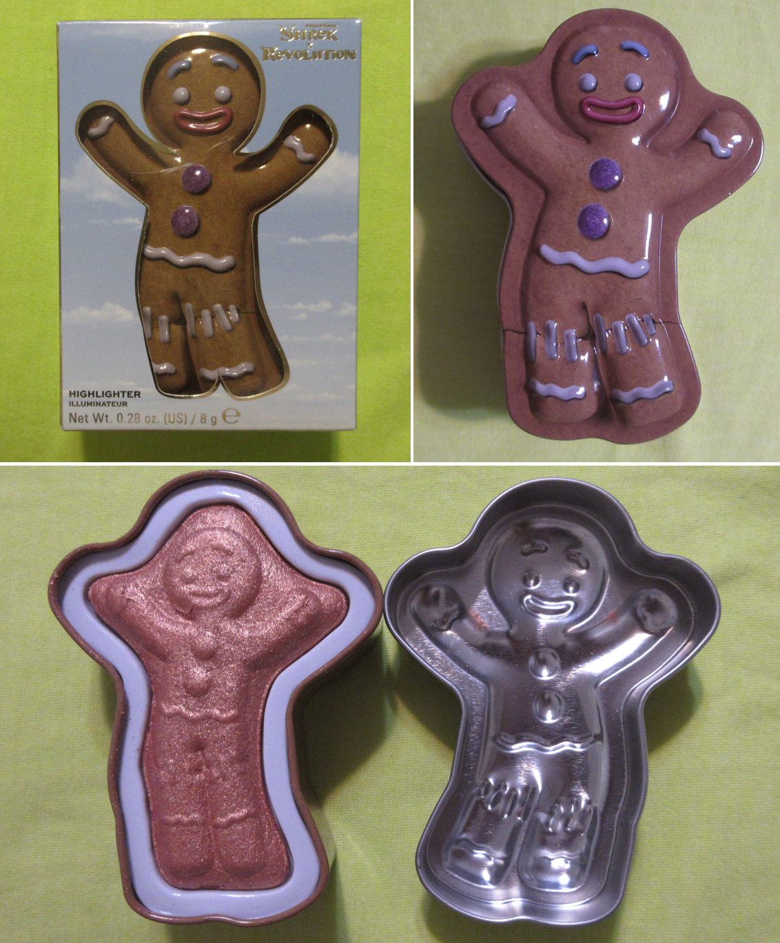 I bought the highlighter purely for nostalgia. I love Gingy! The Shrek series (really just 1 and 2) was my favorite series after the Mummy Series (again 1 and 2) for a very long time! I think Rush Hour 1 and 2 (okay apparently I only like the first two of trilogies) surpassed the Shrek series by now, but I still love those movies and Gingy is still my favorite. However, for review purposes I have worn it a handful of times. When I’m using my winter foundations, the highlighter is too deep of a bronze for me. In the photo above where I’m not quite at my typical summer shade but a little darker than I have been in a while, it seems to work well enough when used sparingly. In complete direct light, my camera can pick up the texture to the shimmer particles, but looks smoother at most other angles in the light. In fact, it’s smoother than I expected from a Revolution Beauty product. I’m a bit impressed! I don’t intend to use it anymore though since I want to keep it for nostalgia purposes, but it’s good enough that I could. Also, this used to have a strong gingerbread scent, but that faded in the year that I’ve had this.