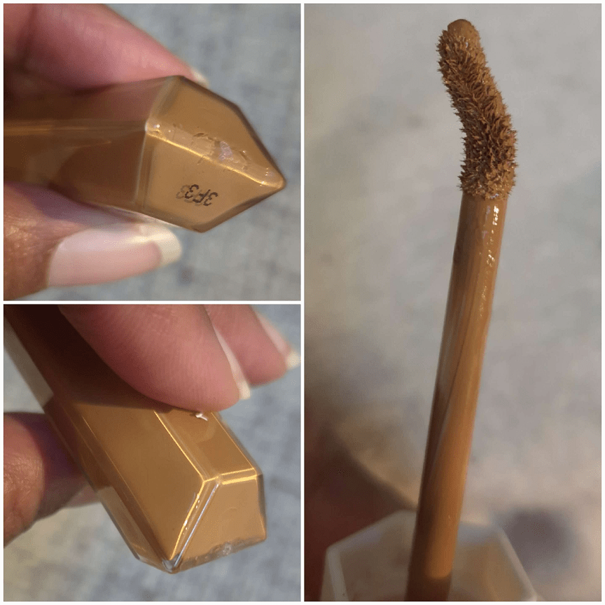 This isn’t a deal-breaker, but the Fenty packaging doesn’t allow one to stand the concealer upright. There are too many pointed edges and the only flat parts are the front and back, so it has to be stored in a laying position unless it’s stored in a container. Also, it has an interesting curve tip for distributing product.