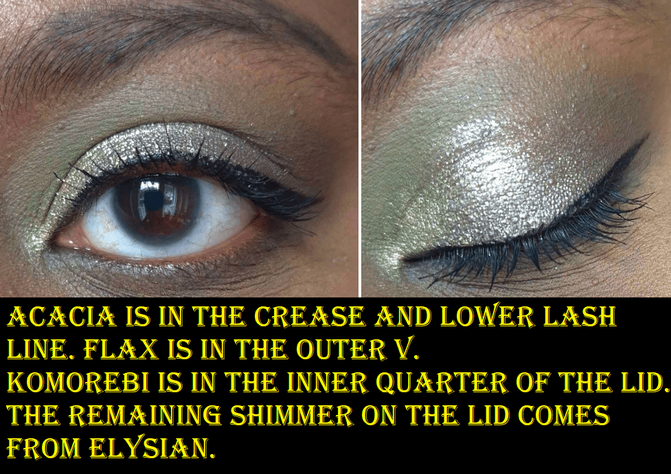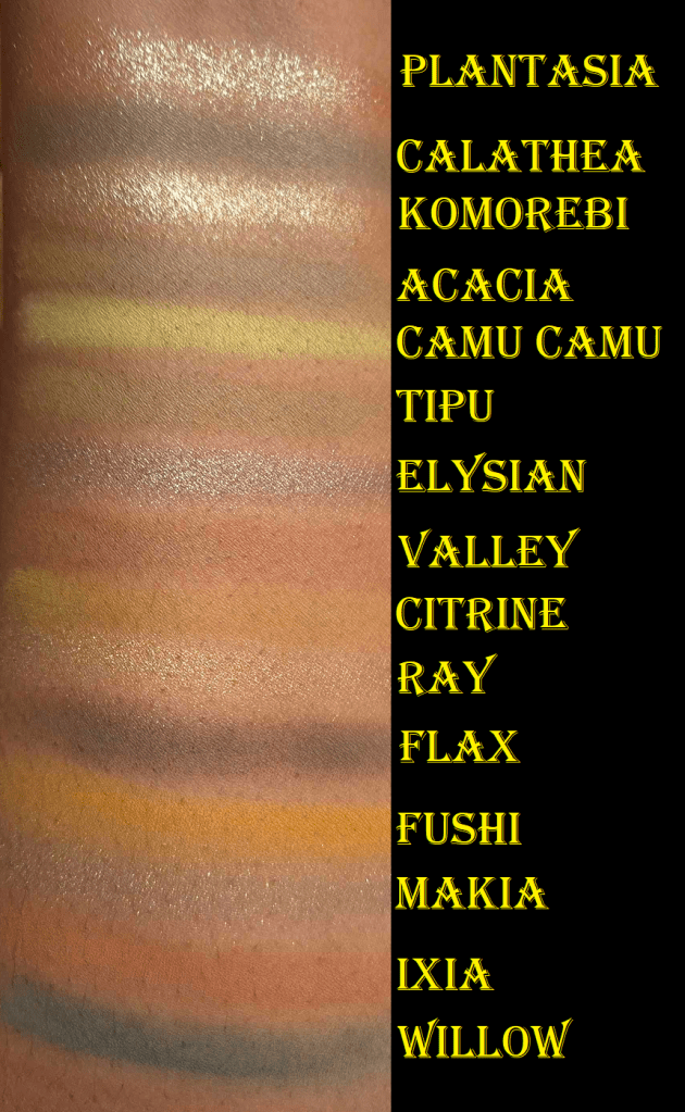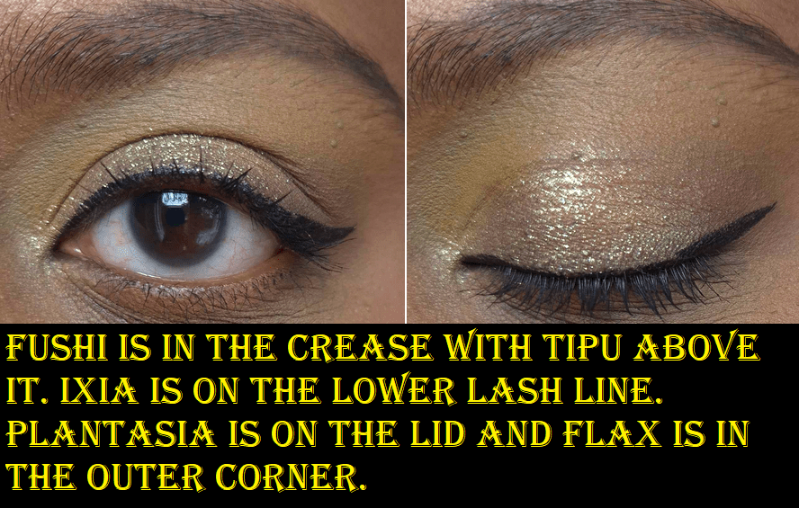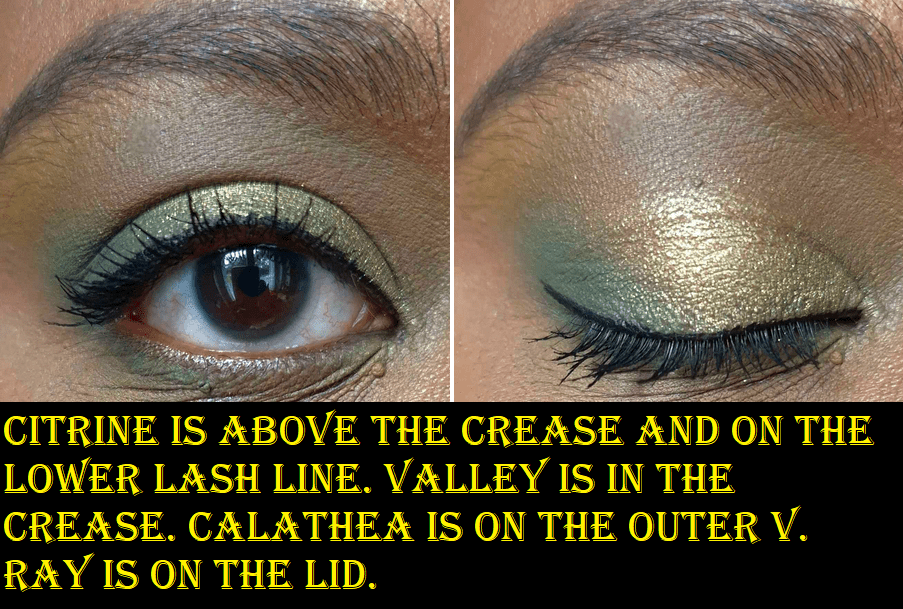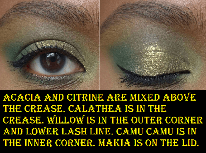 The shimmers are the best aspects of this palette, aside from Fushi. They give impact. They have sparkle to them. They don’t fade. They have minimal fallout and don’t require being applied dampened. However, I noticed that these are sheerer than I’m also used to. I can see my skin underneath, which makes them not look the same way as I envisioned. For example, Plantasia looks like an orange-reddish-bronze in the pan, but I see more golden-yellow on my lids. In order to get a warmer tone, I have to fake it by putting an orange matte underneath so that color is what shows instead of the brown of my skin. The same goes for Makia that I expected to be antique gold-olive, but looks more lemon-lime. For more green, I have to put a green shadow underneath. Those two were the shadows I was most excited to have, besides the cream-powder ones, so I was admittedly a bit disappointed.