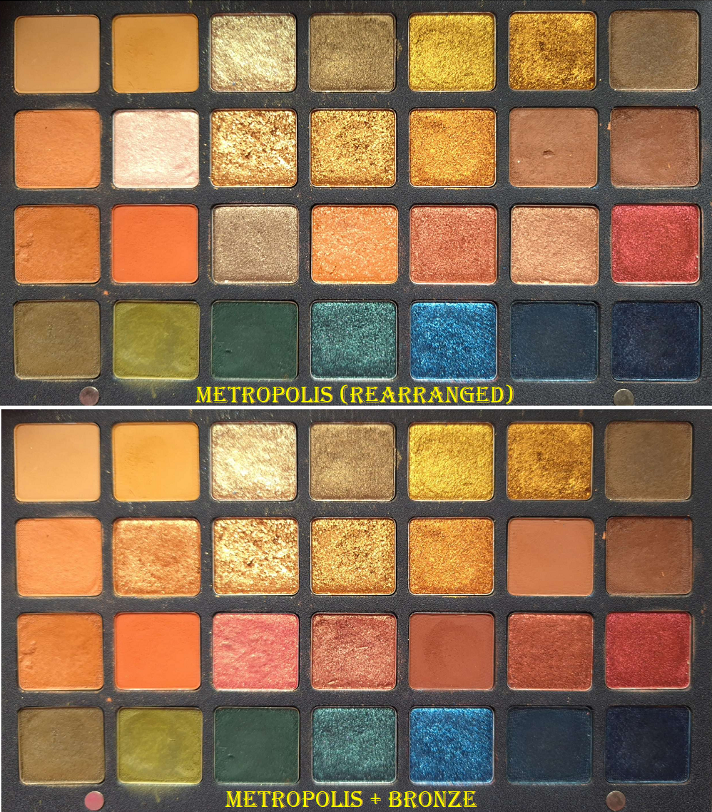 I was using this palette quite a bit, until I decided to swap around six shadows into the Metropolis palette. I feel like my changes still improved upon the Bronze palette, but it could have benefited from being condensed down. Unlike purples and greens which I could own plenty of in a single palette and be content with the various nuances, the subtleties of bronze and oranges and everything in-between couldn’t hold my attention. This palette is so visually appealing that I couldn’t bear to leave it behind, but I don’t love it enough to actually use it as often as I should.