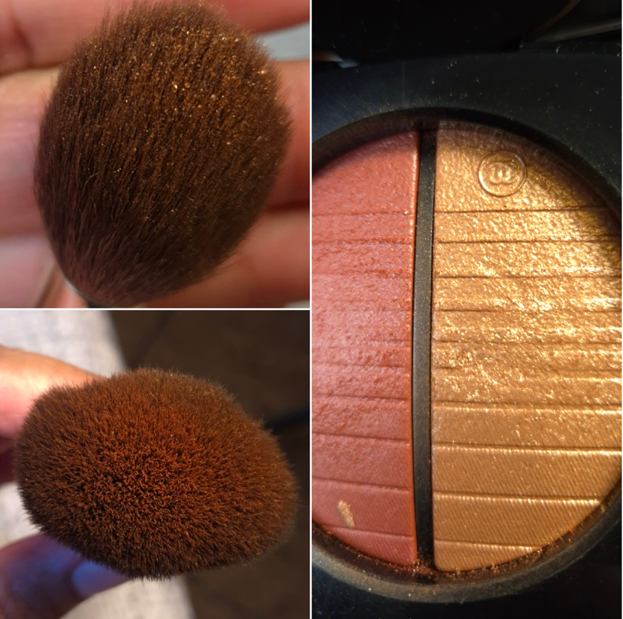 Though I’m faced once more with a blush that’s on the sheer side, I have an easier time picking up product and building up the color now that I have been using the Bisyodo Cheri Series CH-FD Foundation Brush. Soliel Couchant is also less hard pressed than Beige et Corail, so that will reduce some of the potential frustration over time. The photo below shows some of the flaky bits of the highlighter as it comes off the surface onto my holy grail highlighter brush that’s also from Bisyodo’s Cheri Series, the CH-HC Highlight/Cheek Brush.