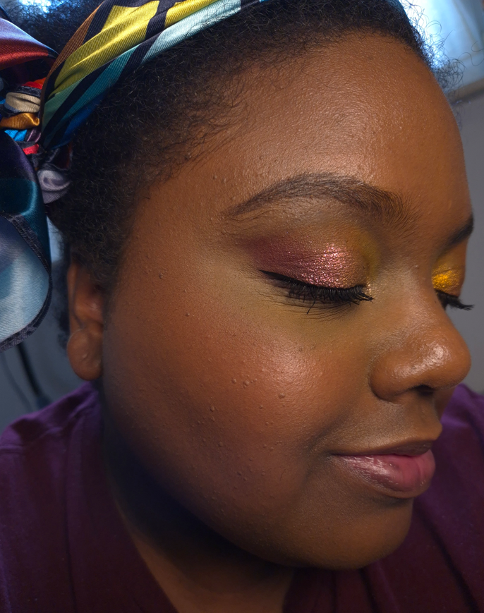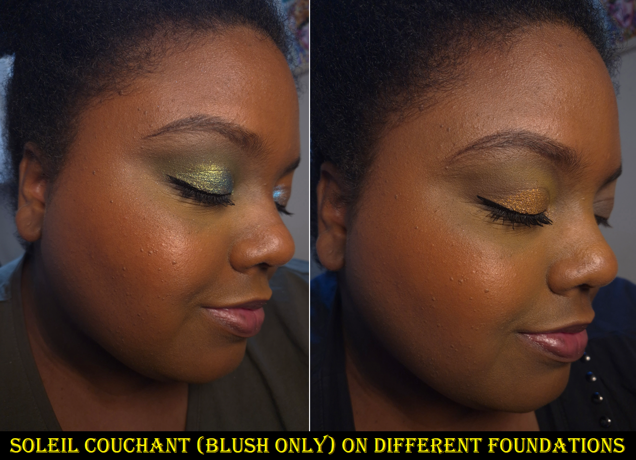 The highlighter is a beautiful color that suits me very well with its depth and tone. What is surprising and fascinating to me is that although I can see the individual sparkles, I really like how it looks when paired with the blush! I typically hate glittery highlighters because they look like I got fallout from my eyeshadow instead of being intentionally placed. I prefer highlighters that give a glassy glow and look like my skin is naturally luminous with undetectable shimmer. This highlighter from Soliel Couchant somehow doesn’t emphasize texture and adds a soft twinkle. I don’t know why this is different from other glittery highlighters to me, but it is!