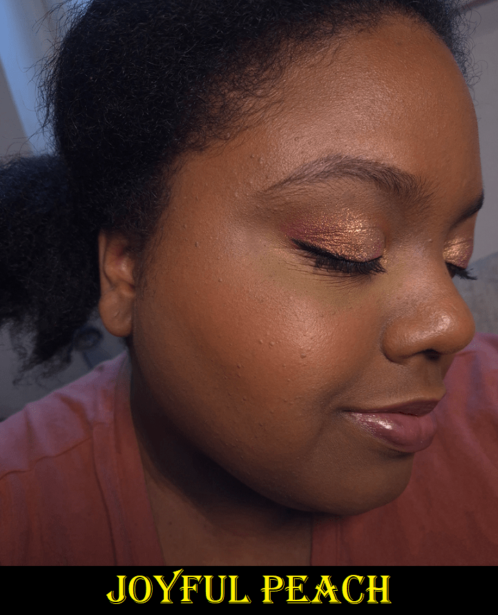 The issue for me is the same across the board with using bronzers, blushes, and highlighters that excel in looking smooth and refined around the face, that they create too soft of a look on my eyes. With Joyful Peach, I can only build up to medium opacity. I have to make sure my eyeshadow base/primer completely obscures my skin discoloration before adding this shade on top, or else the darker spots show through underneath. Pigmentation issues aside, this doesn’t seem to have an issue with fading, adherence, or layering with other eyeshadows. So, this can work for eyeshadow purposes depending on someone’s style/preference.