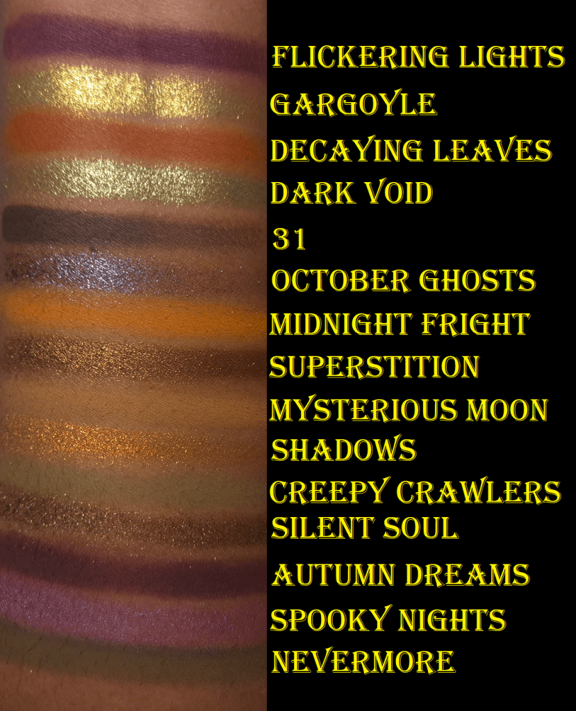 The important thing to note about specific shades is that Creepy Crawlers and Nevermore look very similar on my eyes when used together, but it can’t compete with the twin-ness of Flickering Lights and Autumn Dreams.