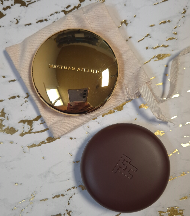 This has a tiny mirror that I don’t use, and a magnetic closure. The brand has highlighters and face powders in this same style of packaging. I haven’t used their cream sticks or drops, but they don’t look as luxurious to me. The only other Westman Atelier packaging I have handled are the powder duos, which are certainly substantial and pretty to look at, but I don’t think it compares to this gold compact.