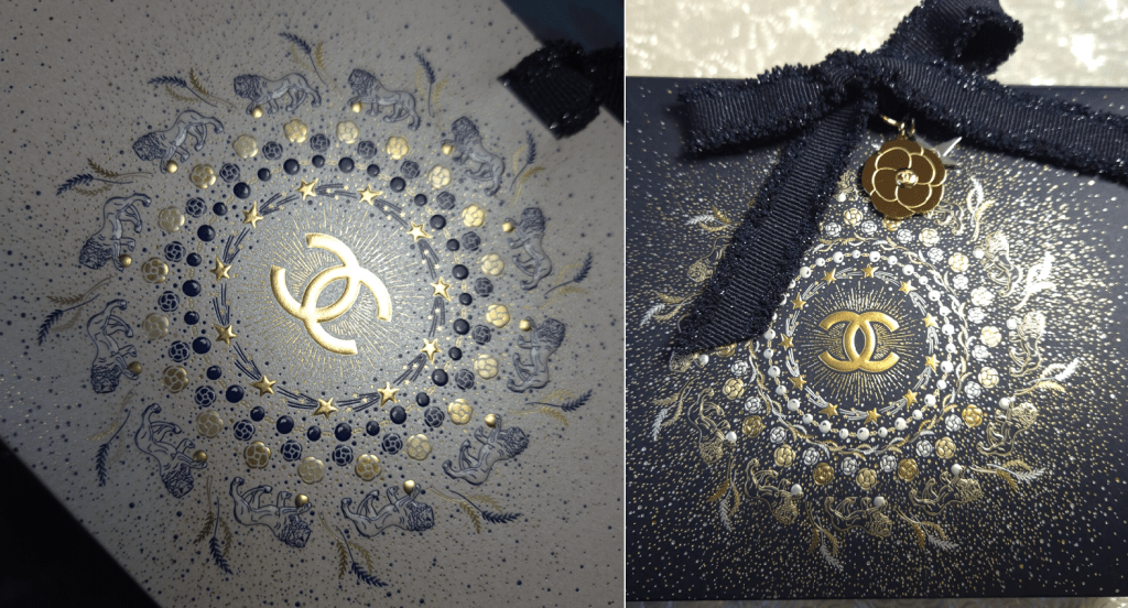 For the holidays, but starting in October 2025, Chanel gave customers the option of choosing special holiday gift packaging instead of their classic white with black-trim bags and boxes. The options were a smaller white bag, a larger deep blue bag, and then I’m not sure how many box varieties there were. The ribbons were dark blue with some glitter specks and the pattern design had a mix of gold, silver, and blue coloring. They were absolutely stunning!