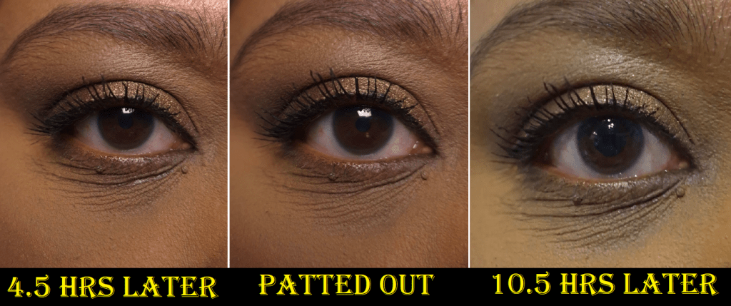 Technically, if I continually touch up my under eyes (for example smoothing out the creases with the remnants of what is left on my concealer brush and then powdering it with the remnants of what is on my setting brush), it can look “passably” faded between 8-10 hours before it’s not salvageable anymore. However, I consider that very unrealistic. I don’t like to babysit my makeup.