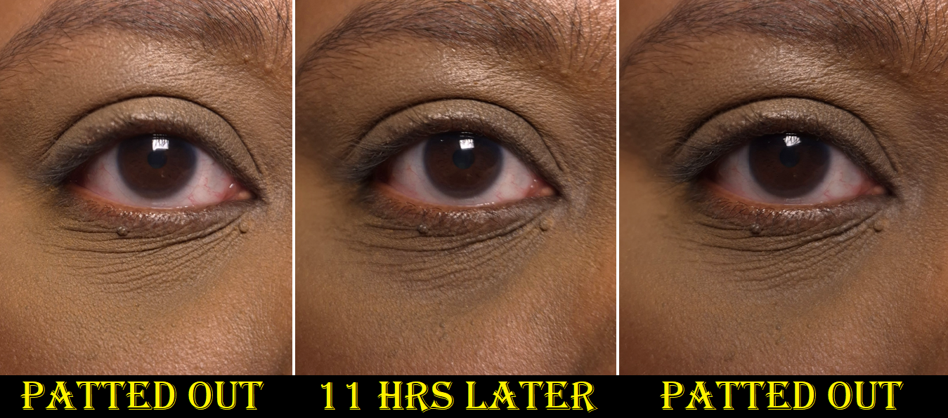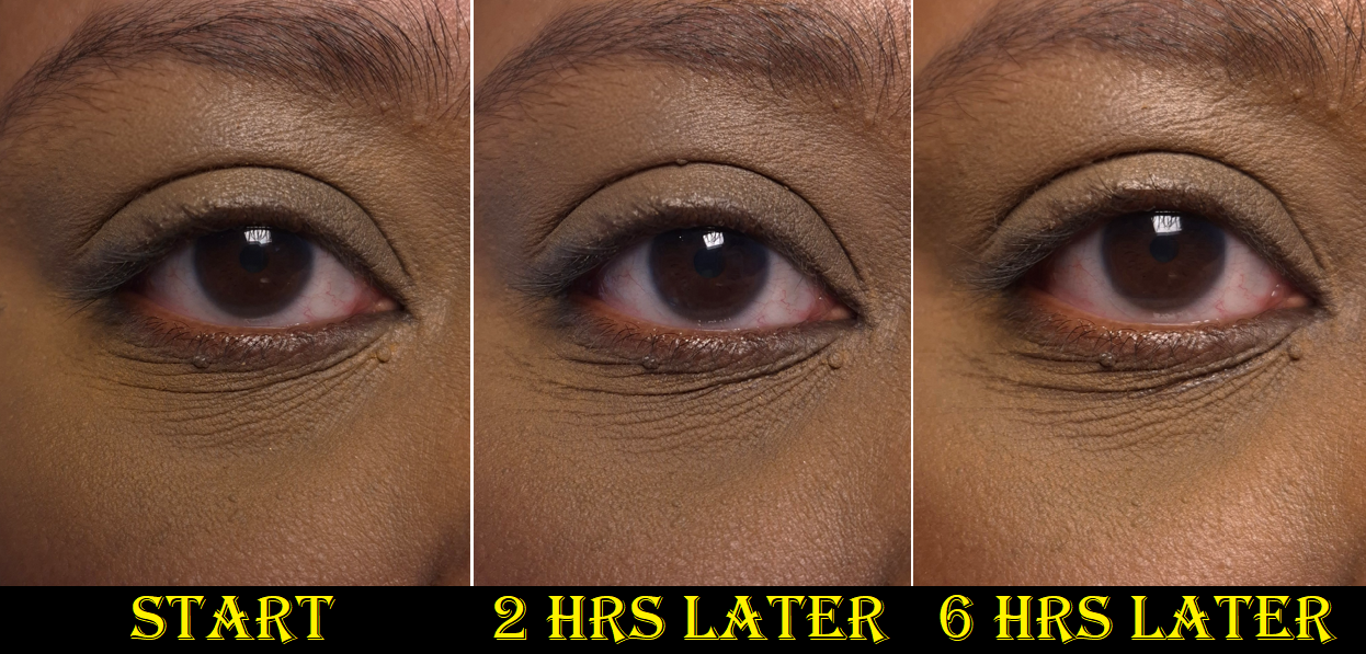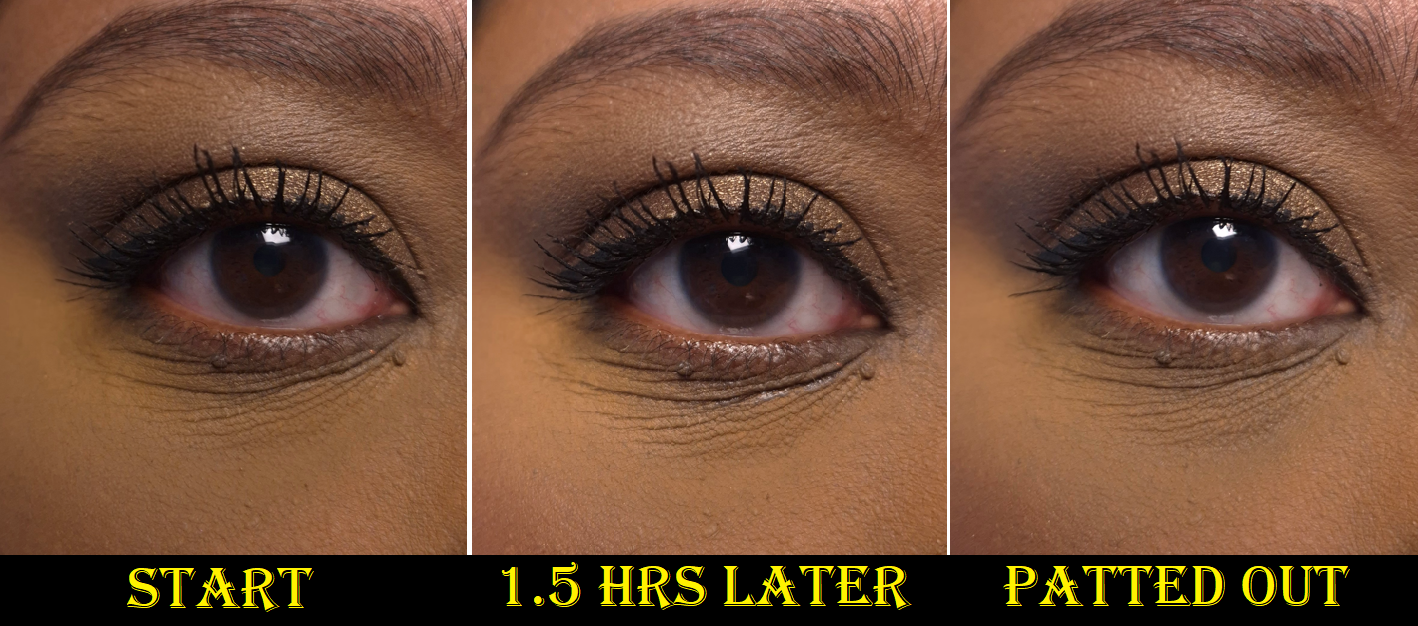 Technically, if I continually touch up my under eyes (for example smoothing out the creases with the remnants of what is left on my concealer brush and then powdering it with the remnants of what is on my setting brush), it can look “passably” faded between 8-10 hours before it’s not salvageable anymore. However, I consider that very unrealistic. I don’t like to babysit my makeup.