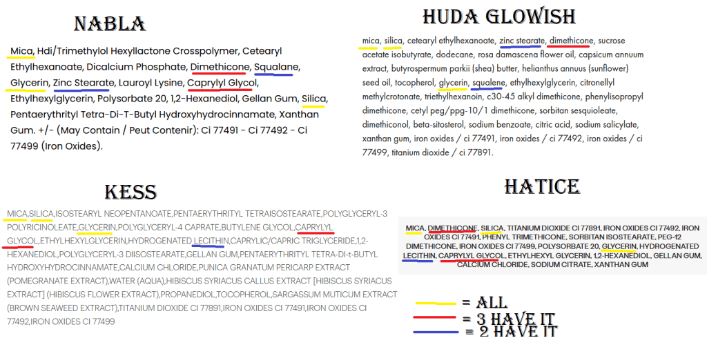 Second Row: Prada, Huda, Vieve, Dior, Kaja, Sigma, Milk, Juvia’s Place, Pat Mcgrath, Suqqu, Nars, and Pur Cosmetics.
