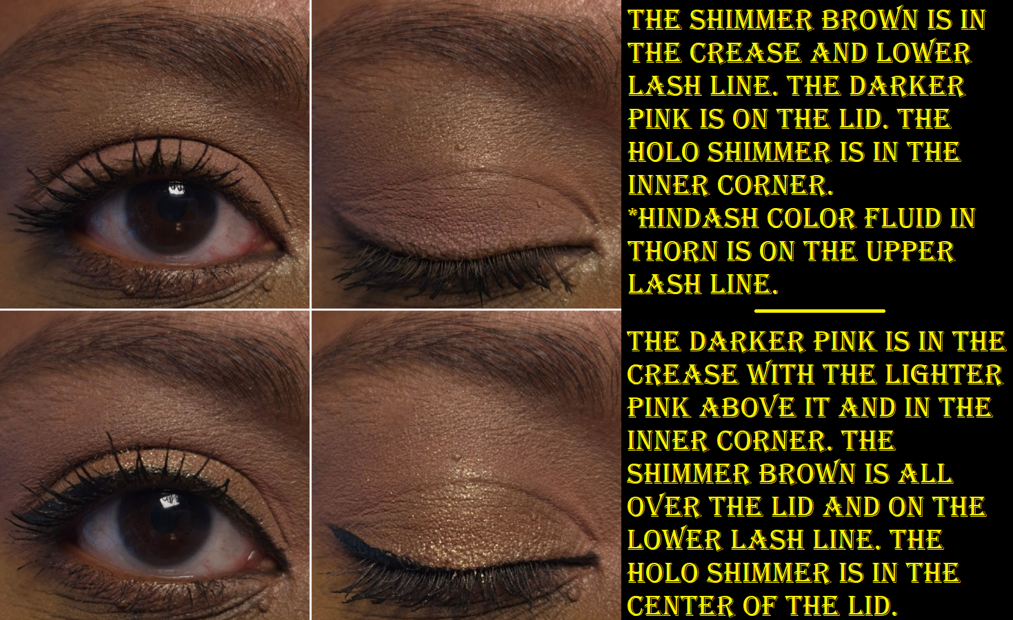 I’m the most confused by the description of Suspension as a, “plum with soft gold shimmer,” when it looks purely silvery to me. Perhaps they mean white gold? It’s a bit thicker of an eyeshadow and grittier. I definitely need to wet this or use glitter glue. It’s one of the most glittery shades in this palette and contains slightly larger shimmer particles than the others. Even though it has a dark base, that reflect is so sparkly and bright that I can use it like a highlighting shade to amp up the overall bling level of the eye look. I’ve tried using it in the outer corner and utterly failed to create depth there.