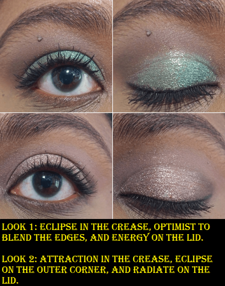 This was a birthday gift from one of my best friends. One of the complaints I’ve had about Urban Decay shimmers is that they aren’t punchy enough for my style. These shimmers are more of my taste, however, the base color of these shades are so vibrant in the pans, but the marbled silver makes each color a lot lighter when actually applied to the skin. Seeker would be so much prettier if more of the purple flecks of shimmer could show through, as well as the lighter and darker blue. Energy is also still pretty, as I can still see some of the gold shimmer with the green, so I don’t mind as much that these two shades are lighter. However, Radiate changes to a light pink which I really don’t care for. This is the reason that even though the Full Size Stoned Vibes palette has been on sale for 50% off, I decided not to get it. I love the shades in the pans but those aren’t the colors that end up on the eyes. As for this palette, I’ll continue to use it and will pretty much have the same 2-3 mattes in the crease (Attraction with Eclipse or Optimist with Eclipse) with either Seeker and Energy. The mattes blend well, but I only like to use Optimist as a shade to blend edges, Eclipse as my deepening shade, and Attraction in the crease of a warmer toned look. The only times I’ve continued to use Energy is when I’ve patted a separate multichrome shadow on top.