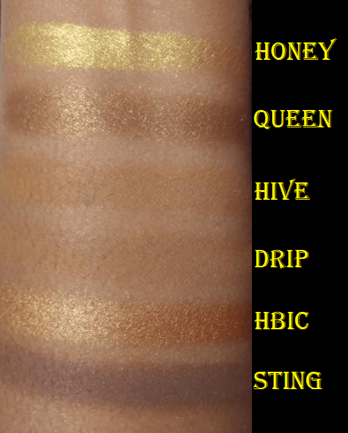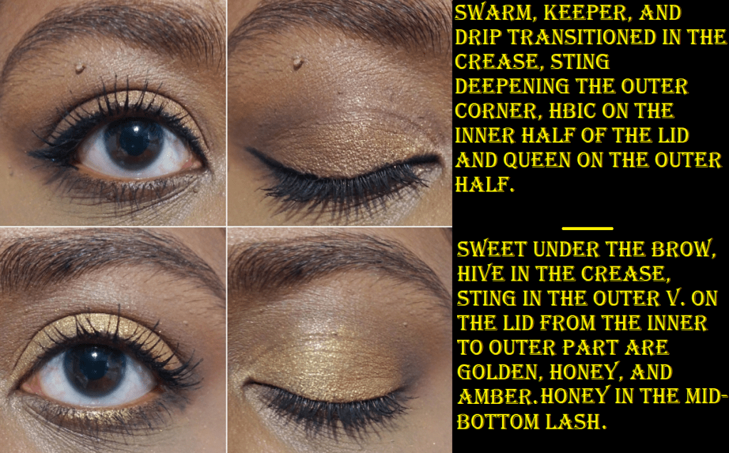 Sweet is the type of pale shade with a pink undertone I generally ignore in palettes unless it’s my only light/blending/highlighting shade option. Swarm will take the job of Sweet since it’s light enough and warmer, but even though it looks different in swatches from Keeper, on my eyes there is very little distinction between Swarm and Keeper. I could use them interchangeably. In swatches, it’s easy to see how Hive and Drip look like the same shade on me, with Hive just being a touch more yellow, though they’re both clearly warm toned browns. I believe these are intended to be midtone shades to add depth for those with skin tones lighter than mine, and I say this because these are too light to add any depth for my eyeshadow look. I could use these as brow bone transition shades because they’re still not far off from Swarm and Keeper. Sting is the only shade that I can use to create some shape but it’s still not dark enough for my taste. It’s darker than my typical mid-tone shade, but it’s also far from being as deepening of a shade as I want. So, I’ve come to realize that this palette doesn’t have as nice of a gradient for my skin tone as it would be for someone pale to maybe even light caramel. The mattes aren’t as pigmented as the Born to Run, but they’re still at a respectable quality and they’re blendable. I enjoyed using them, but to get the kind of look I prefer, I would basically have to use some variation of Swarm-Hive-Sting or Keeper-Sting every time. Regardless of the light to dark mattes I used, it would essentially turn out the same every time with just a different lid shade.