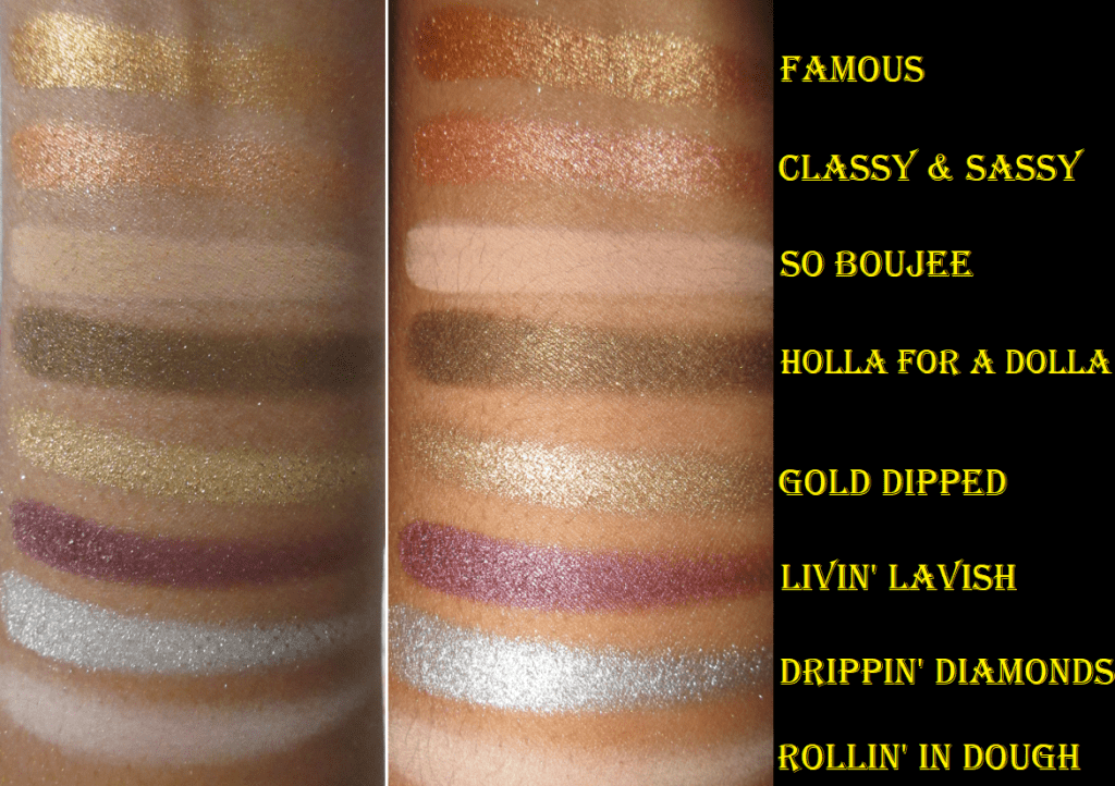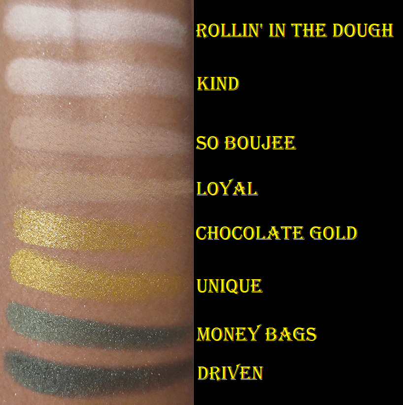 Speaking of lid shades, the shimmers are easy to differentiate in larger areas like a swatch, but if I actually use them next to each other on my lid, it’s hard to see a difference. In this situation, I actually don’t mind that because I usually have a maximum of two shimmers on lid: the main color and the highlighting color. I appreciate that these shades are legitimate shimmers and not satins like the Born to Run, but they still don’t have the full impact that I prefer, so I would only want to use one shimmer from this palette and supplement it by using another brand’s shadow as the highlighting shimmer anyway. I can use Golden next to Amber when I want a light-orange gold to transition into a more orange gold on the lid. I can use Honey when I want a yellow gold, Queen when I want a golden brown, or HBIC when I want a lighter golden brown than Queen.