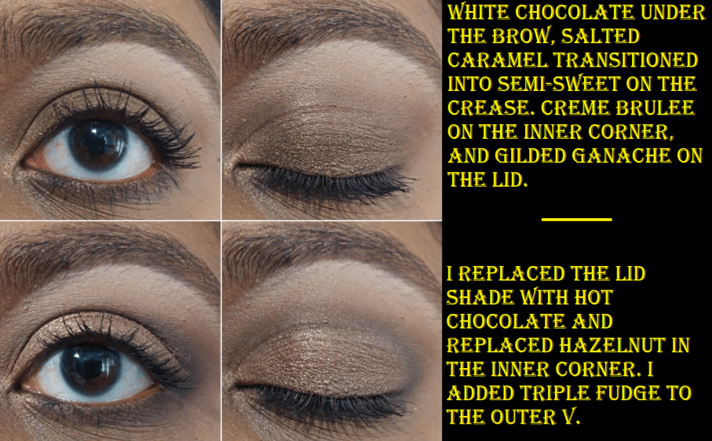 I took the Semi-Sweet Palette out of retirement to compare the shades. In doing so, I noticed minor random things about the packaging. The Chocolate Bar has the weakest magnetic closure and the lid of the tin doesn’t lay flat. It remains propped upward like the Pat Mcgrath Celestial Divinity palette. The Semi-Sweet has a slightly stronger magnet and lays flatter back than its predecessor. The Chocolate Gold actually snaps closed and doesn’t rely on magnets at all, but I have to put my nail in the indented space to open it. The palette container/packaging, rather than tin, feels completely made of plastic and it opens flat back so that I can naturally hold it by the edge of the mirror and bring it closer to my face in a way that the others wouldn’t allow. The mirror also takes up the entire space under the lid cover instead of the much smaller sliver of mirror space in the other two palettes. I would actually use the mirror in the Chocolate Gold palette to do my eyeshadow makeup, but not the others.
