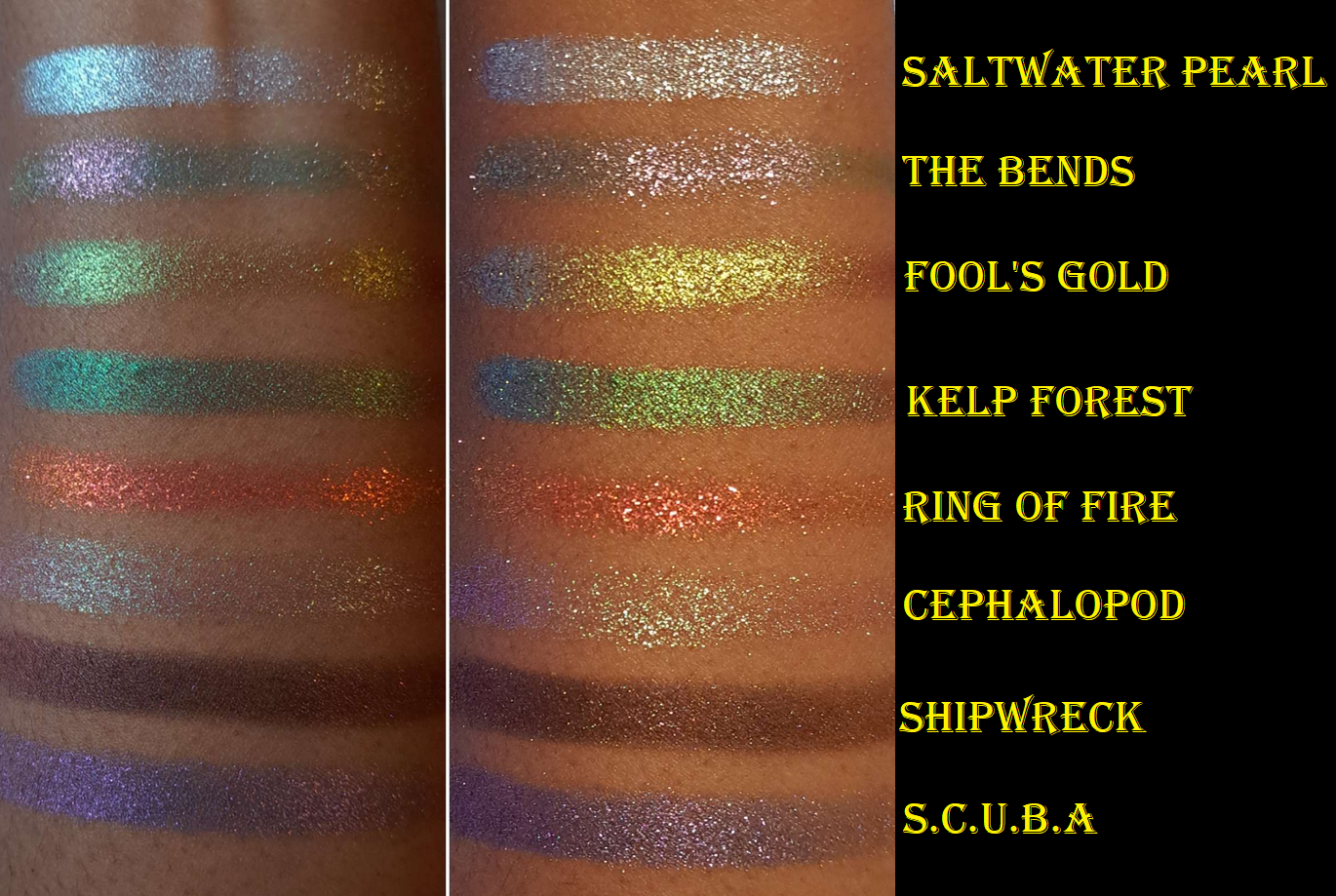 Also, Shipwreck is the smoothest shade that I can apply directly to my eye area with my fingers. Saltwater Pearl, Fool’s Gold, and Kelp Forest are fairly smooth as well. However, S.C.U.B.A. is semi-flaky. The extremely flaky ones are The Bends, Ring of Fire, and Cephalopod, so I have to apply them with a damp brush to minimize fallout and prevent making a mess everywhere under my eyes.