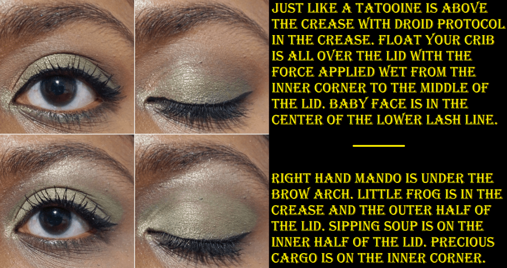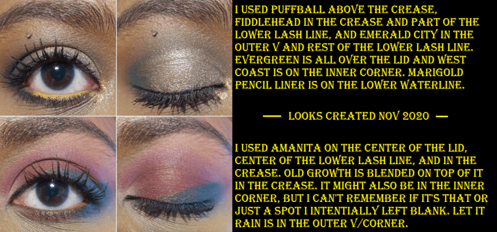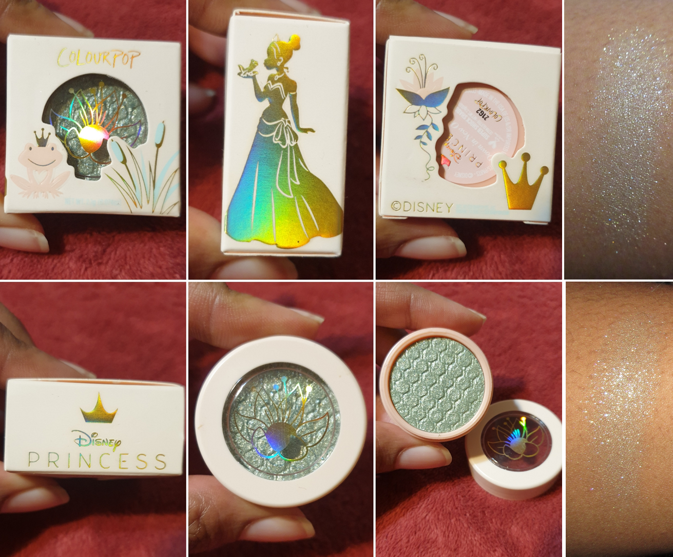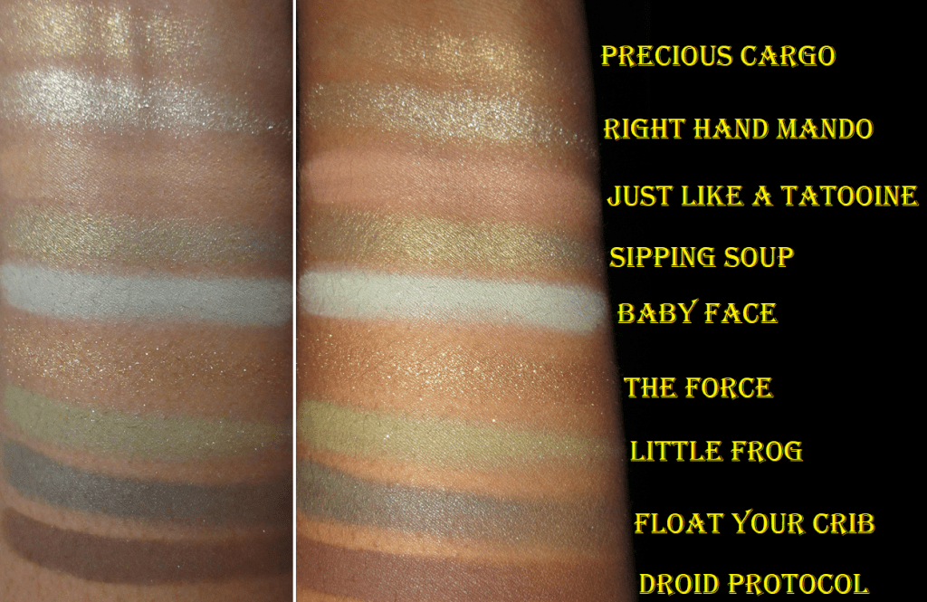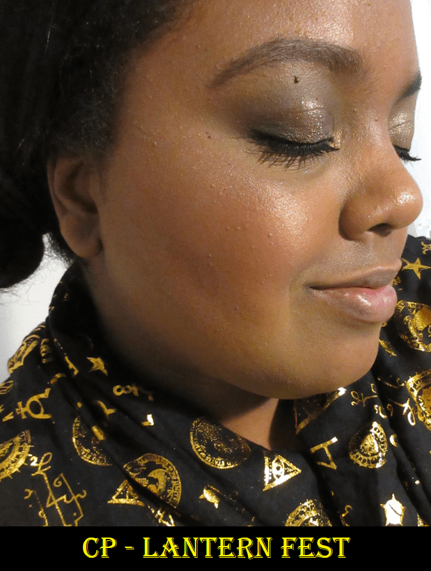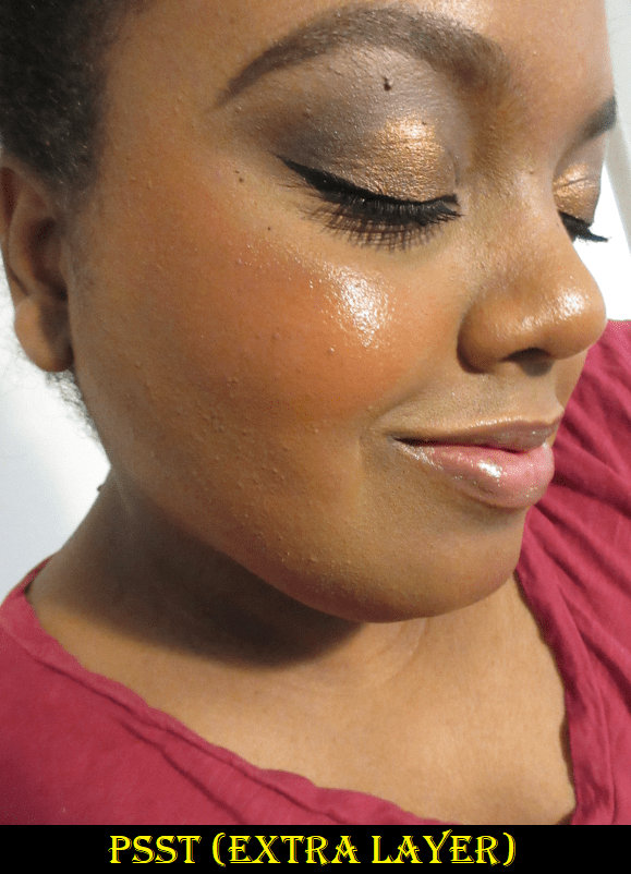 For times that aren’t Halloween, I learned that when I want something unique yet wearable, I just need to put on a deeper highlighter (like Colourpop’s Mind Over Matter) and add Find the Book on top of it. This combination does change the color a bit. Green is still present, but the bronze-orange tone in Mind Over Matter mixed with Find the Book really intensifies the gold. I decided to show that very example in the two photos below. They have been cropped to just show the cheekbone highlight because the day I took the pictures was intended to just be an eyeshadow palette testing day when I often just put makeup around my eyes and leave everything else alone. On this particular day, I skipped foundation and did not conceal the hyperpigmentation around my mouth, so I didn’t feel comfortable showing a full face.