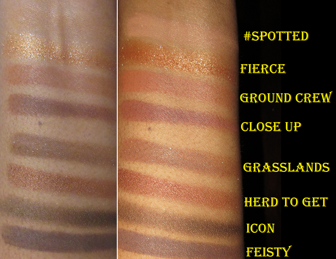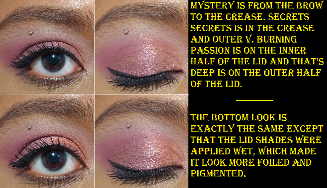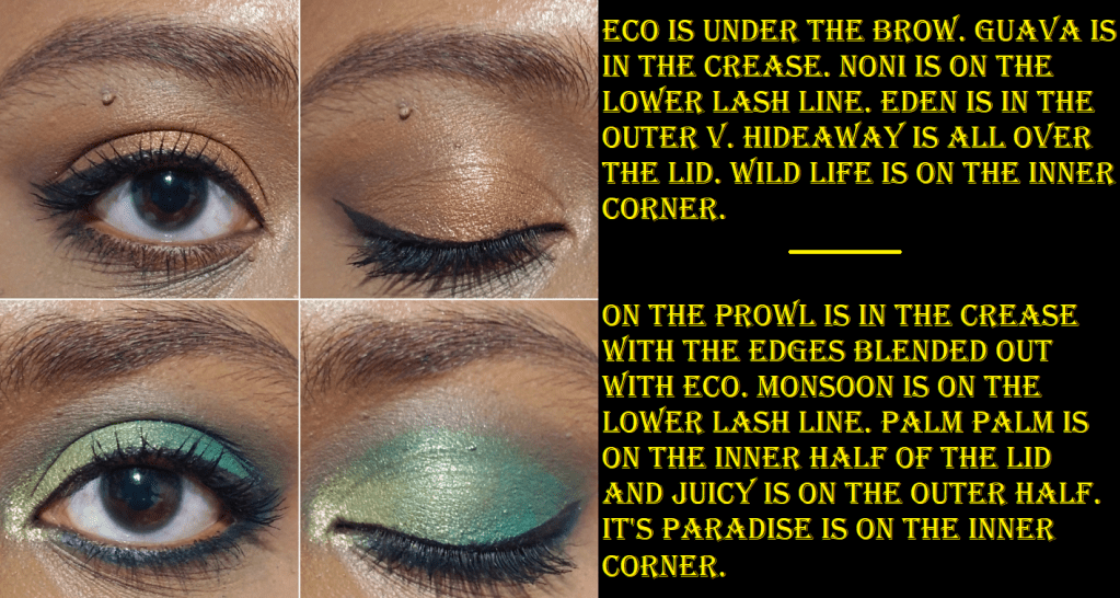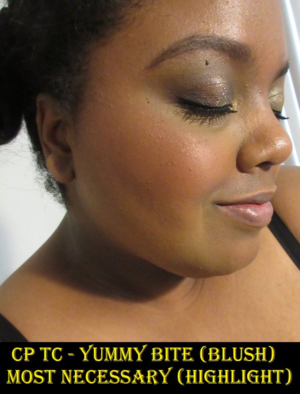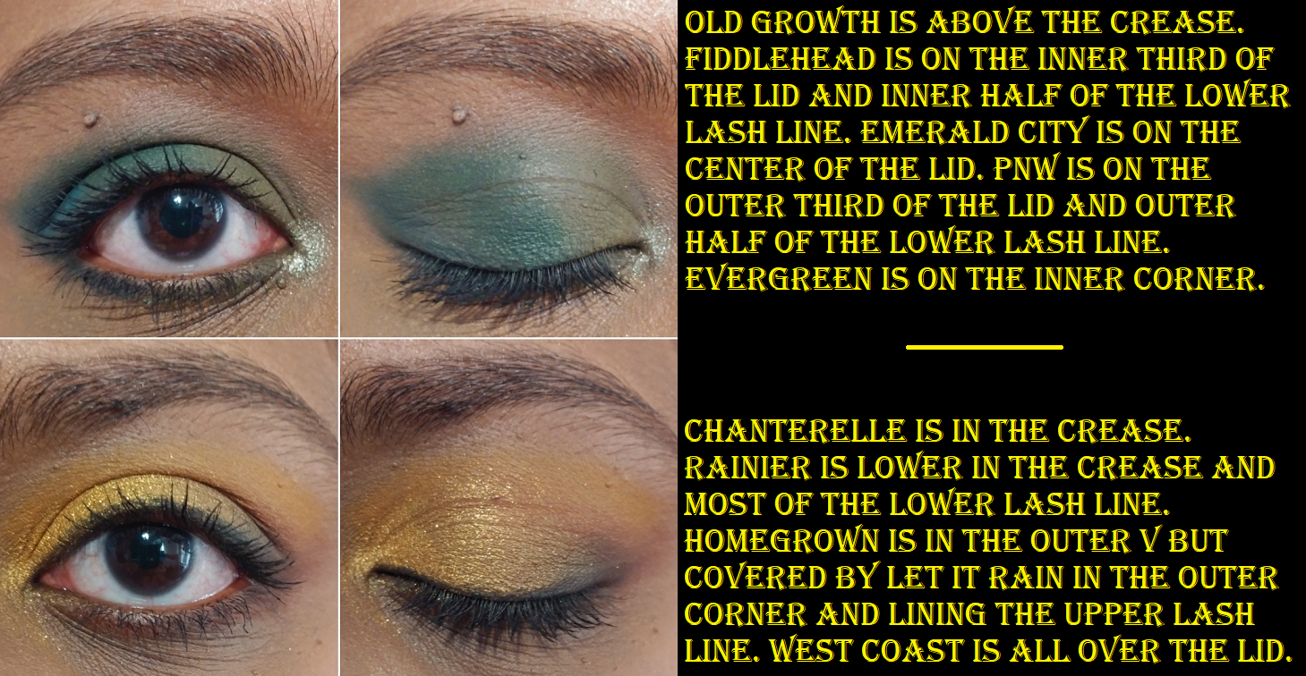 For times that aren’t Halloween, I learned that when I want something unique yet wearable, I just need to put on a deeper highlighter (like Colourpop’s Mind Over Matter) and add Find the Book on top of it. This combination does change the color a bit. Green is still present, but the bronze-orange tone in Mind Over Matter mixed with Find the Book really intensifies the gold. I decided to show that very example in the two photos below. They have been cropped to just show the cheekbone highlight because the day I took the pictures was intended to just be an eyeshadow palette testing day when I often just put makeup around my eyes and leave everything else alone. On this particular day, I skipped foundation and did not conceal the hyperpigmentation around my mouth, so I didn’t feel comfortable showing a full face.