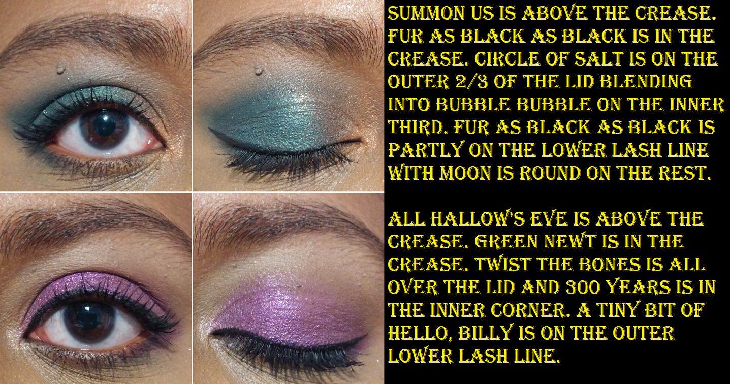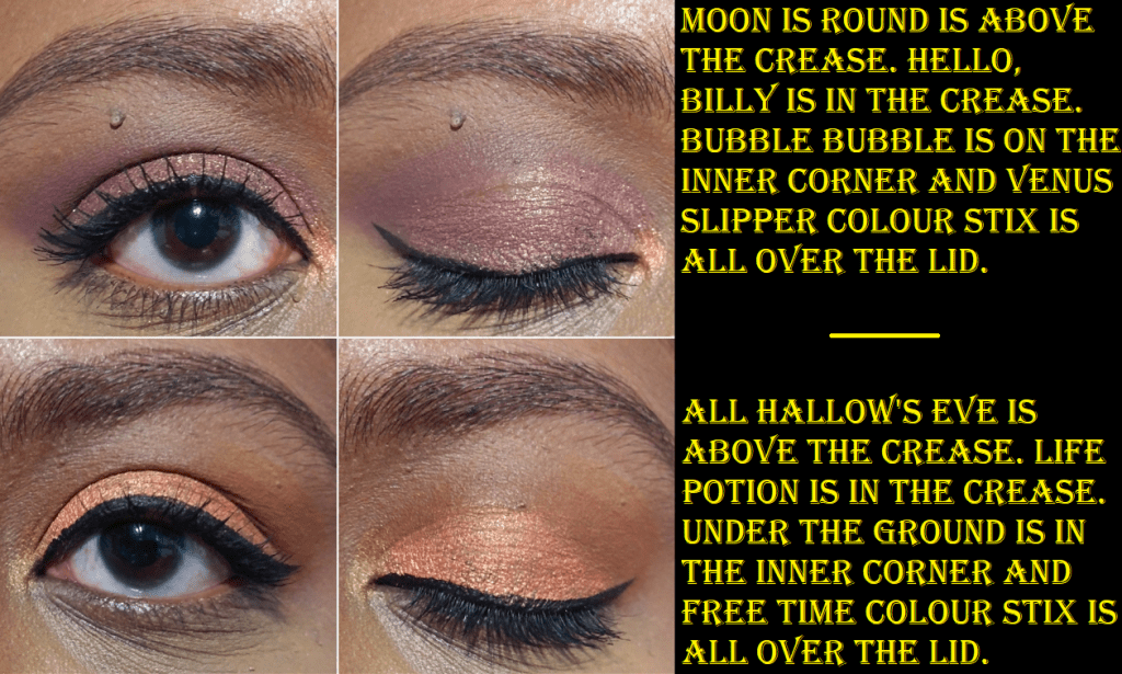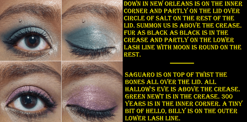 In the Halloween look above, I’m wearing the Butcherson mascara on the tips of the lashes, Find the Book highlighter (on the top of the cheekbones and inner corner of the eyes), and the kitty ears. The third photo on the bottom was taken with my cell phone to show the brightness of the highlighter that I struggled to capture with my regular camera.
