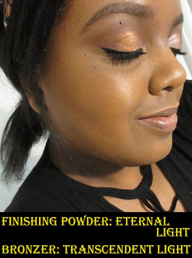 Eternal Light is a golden brown finishing powder that matches my face perfectly! It’s a stunning beautiful color. It gives a luminous sheen but also has a few flecks of gold glitter throughout. I wish those larger gold particles were not there, but I’m willing to overlook it because of how nice the sheen is and the overall effect on my face. If I want to avoid having glitter specks in random places, sometimes I don’t set my entire face with this powder and just apply it in the areas of my face I would normally highlight. I have especially enjoyed using this powder with the Wayne Goss 00 Powder brush.