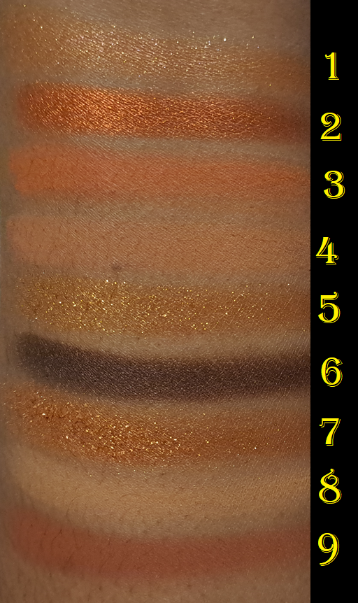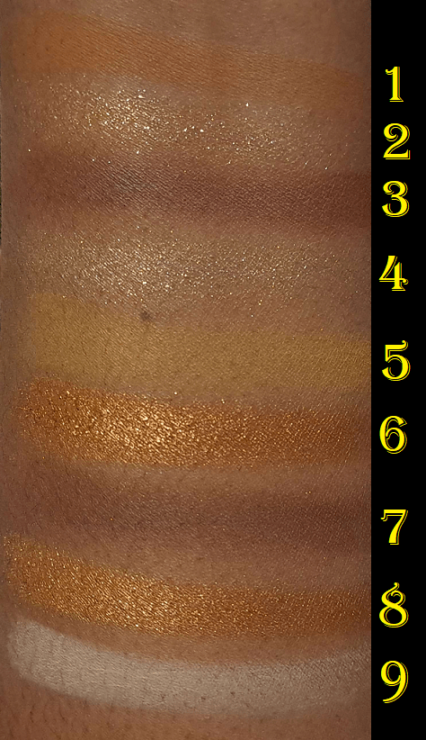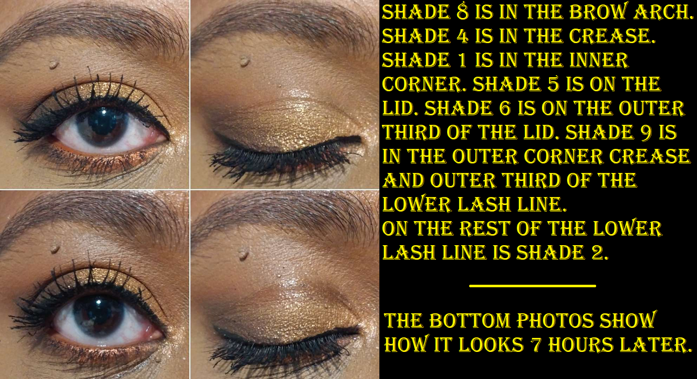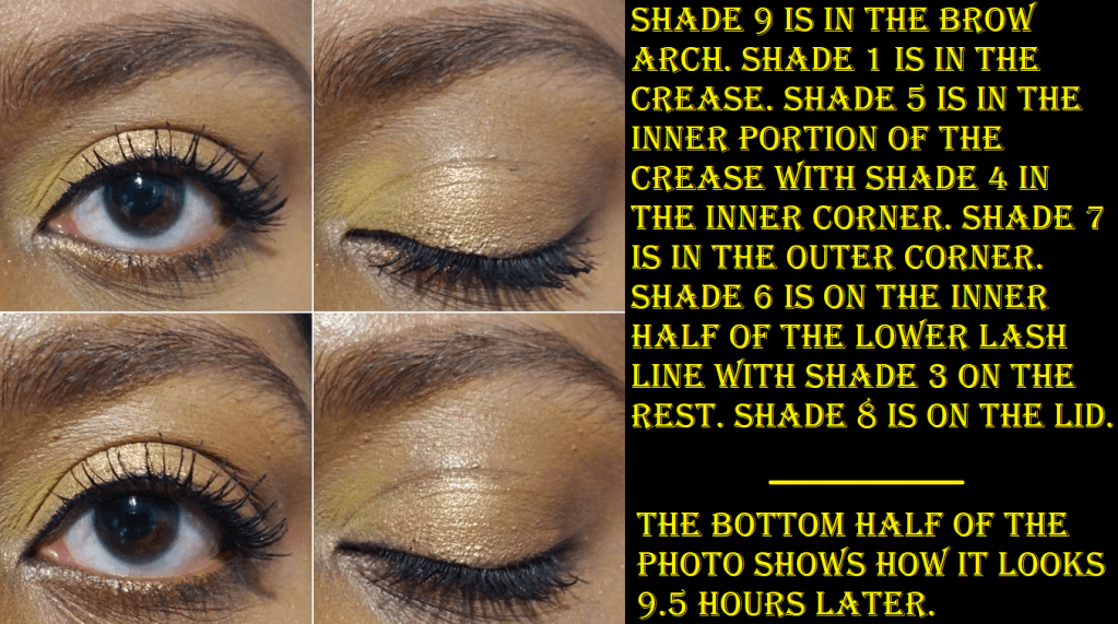 I think gold shades and warm tone neutrals are pretty, so I couldn’t resist this palette any longer. Shades 1, 3, and 9 are similar matte quality to the other Obsessions palettes, but not quite the same level, and I’m not sure why that’s the case. They’re a little more dusty in texture, but they blend well enough not to bother me. I just notice the slight difference. The pigmentation level is the same for all except Shade 5 which had to be built up in multiple layers to last on my eyes. This is still a better performing yellow than some in my collection that are usually made too thin and dust away, or are mixed with too much white base, so I’m not unhappy with it. The only matte that gives me considerable trouble is Shade 7, which is patchy. I had to tap on quite a bit of product to get it to cover the bald spot and by the end of the night I still ended up with it looking strangely. Because I still have Shade 3 as a deepening option, I can forgive Shade 7 being a bit of a dud. I also give props for having distinctly different matte colors.