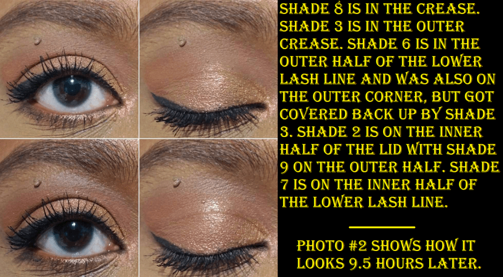 From just swatching the shimmers, I correctly guessed which ones were going to give me the issue where it moves out of my crease line. Shades 6 and 8 resemble the standard Huda metallic-shimmers to the naked eye, but they’re more emollient feeling than the others. To be fair, they didn’t move or crease as much as I expected, but there was still a little movement. The amount I had at the end of the night was tolerable to me. However, some palettes don’t have any shimmers that crease on me, nor patchy mattes, so that’s why this is so low on the ranking list.