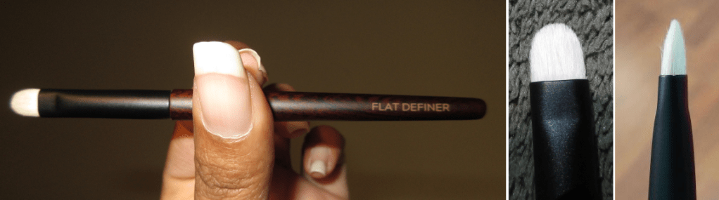 This is more of a liner brush, than for eyeshadow, because it’s so tiny! While it gets the job done, I discovered that I prefer more traditionally shaped liner brushes that are thin (and especially if they have an angled edge). Because this is roundly shaped, I end up stamping and slightly dragging the product in short strokes rather than using longer strokes that I can get from a thin flat brush. The hair feels soft to the touch, but it’s firmly bundled with not much movement. The website states that one could use this to darken the outer V, but it’s too small and too firm for my liking. I don’t like how it feels while trying to apply it that way.