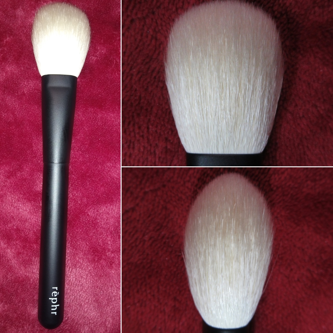 The soft silky bristles, gentle pickup of product, and wispy nature of this brush makes it great for applying a thin layer of face powder and a sheer application of bronzer. Sweeping gestures and circular buffing motions both feel natural with this brush. Because of the generally large size and wide splay area, if someone wants to use this brush with blush, I recommend holding the brush further back on the handles in order to apply less pressure. Doing that allows one to maintain a bit more precision for blush application, but this one is best suited for light applications of face powder and bronzer.