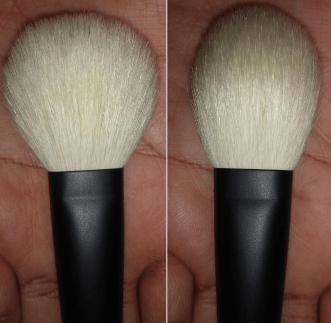 The brush is ovular shaped, not perfectly round. The head tapers to a smaller point so that I can apply bronzer to the perimeter of my face with the tips using short sweeping strokes. However, when I’m using it to apply face powder, I press it down parallel to the pan so that product gets covered on one side, and then I use sweeping motions across the face. This brush has such a wide splay that I lose a bit of control of the placement if I try circular buffing around smaller areas. That’s why I still end up using sweeping or pouncing motions so that the hair moves in the same direction and it gives that soft cushioned feel while I’m applying product. Because I have my favorite powder bronzer brushes already, I use it as intended as an all-over face powder brush. It feels very airy, but it can pick up a sizeable amount of product, so I wouldn’t say this is for someone who wants the barest veil of powder (like someone could get from a squirrel brush). This gives medium pressure buffing and the amount of hair in this brush makes it feel a little more dense and tighter packed than it feels on the skin in practice.
