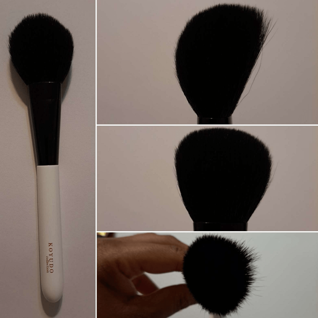 When I posted this brush on Instagram, I was asked how it compares to Hakuhodo’s mix of Gray Squirrel and Goat. Hakuhodo’s mix feels softer because I believe the quality of their goat hair is higher than what Koyudo used. However, I am still very happy with this brush’s softness level. It can be used for bronzer around the perimeters of the face, but I prefer using this mostly for applying and buffing blush. If I need to buff a less blendable bronzer (ones that aren’t within my top 20), then this brush is extra useful for that as well. It has strength from the goat and picks up a nice amount of product, but diffuses beautifully. That’s why I like it with blush as well, for managing to produce a semi-airy effect considering it’s not bundled in an airy fashion. It starts off with a medium application of product rather than light or sheer, while maintaining the look of being well blended. This also makes a fantastic finishing powder buffer brush for someone who prefers a large (but not jumbo), controlled shape.