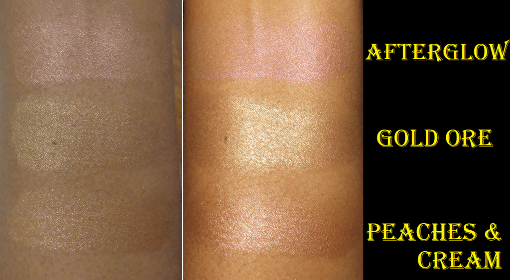 I reviewed these before and even mentioned that I think Peaches & Cream might show up more intensely on me. Ironically, it’s even more subtle than Gold Ore, but I think it’s a far better match for my skintone and even prettier. This product has a tendency to lift, depending on what other makeup I wear underneath it, but because the base color is about my skin tone, it covers up any patches while also having shimmer light enough to reflect and still work as a highlighter for my face.