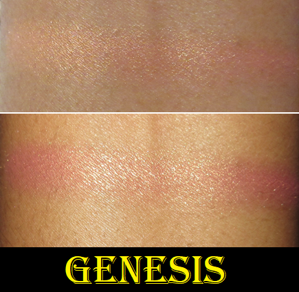 This highlighter was in the “last chance” section of the website, so it’s discontinued now, but something about pink and gold shimmery hues intrigue me. If they’re too pink, I tend to not like them, but if they are gold with a slight pink tinge, I tend to find them beautiful. Genesis is the kind I like. The shine can be built up to medium intensity in person, but it remains subtle on camera. I thought at first it just blended in very well on a day I wore my Rituel de Fille Thorn Oil (left photo), but when I made sure to take pictures again with a drier base, the shimmer particles were more obvious, but still didn’t look very reflective on camera (right photo). So, this is the type of highlighter I would wear in public, but not if I wanted my highlight to pop in pictures.