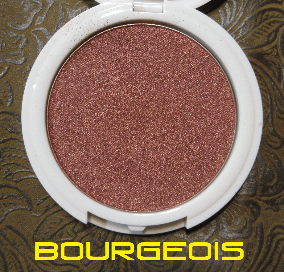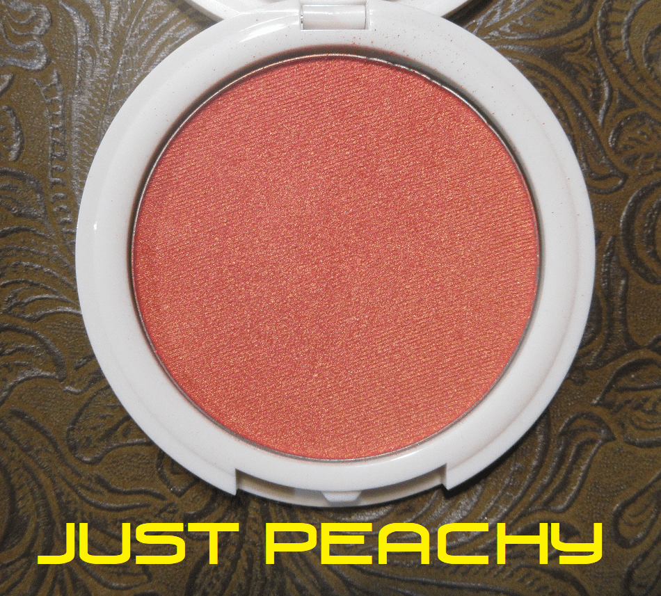 I own two of the Coloured Raine x Power Blush and Highlighter Duos, and while I thought the highlighters were too glittery for my taste, I thought the matte blushes were decent. If Just Peachy and Bourgeois were a matte formula, I know I would enjoy them because the tones are so pretty, but in this formula they are unbelievably metallic! I’ve been struggling with my camera lately and with flash off, it could not begin to show just how metallic looking they are in person when the light hits them, nor the intensity of the shades. If I try to use the lightest amount of Just Peachy, my cheeks look slightly peach from straight on, but when I tilt my head and a little light hits my cheek, all I see is a blinding gold. As pretty as the color itself is, I don’t want a gold blush. If I apply enough product to get the peachy tone to show at all angles, then it looks like I tried to use a metallic eyeshadow for blush. It’s the same case with Bourgeois. The burgundy base color is overshadowed by the intense hot orange shimmer.