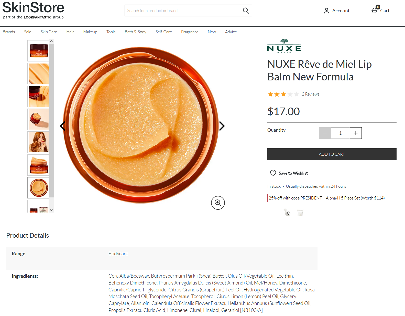 The lip gloss is pretty, but the color doesn’t show as well on me. I chose this shade because it looked like a wearable warm color, but mostly because it was in the clearance section on the Nars website. It’s a bit funny to me that the lip gloss contains more of the ingredients my lips like. It has the hydrogenated polyisobutene, but also shea butter replaces the squalane, and sunflower seed oil is present, though nearly at the bottom of the list. As a thick glossy product, it seals in the moisture better than the balms, but the end result in terms of moisture is the same. When the layer wears down, my lips look drier than when I first put it on. As a gloss though, without any additional expectations for it, it looks nice.