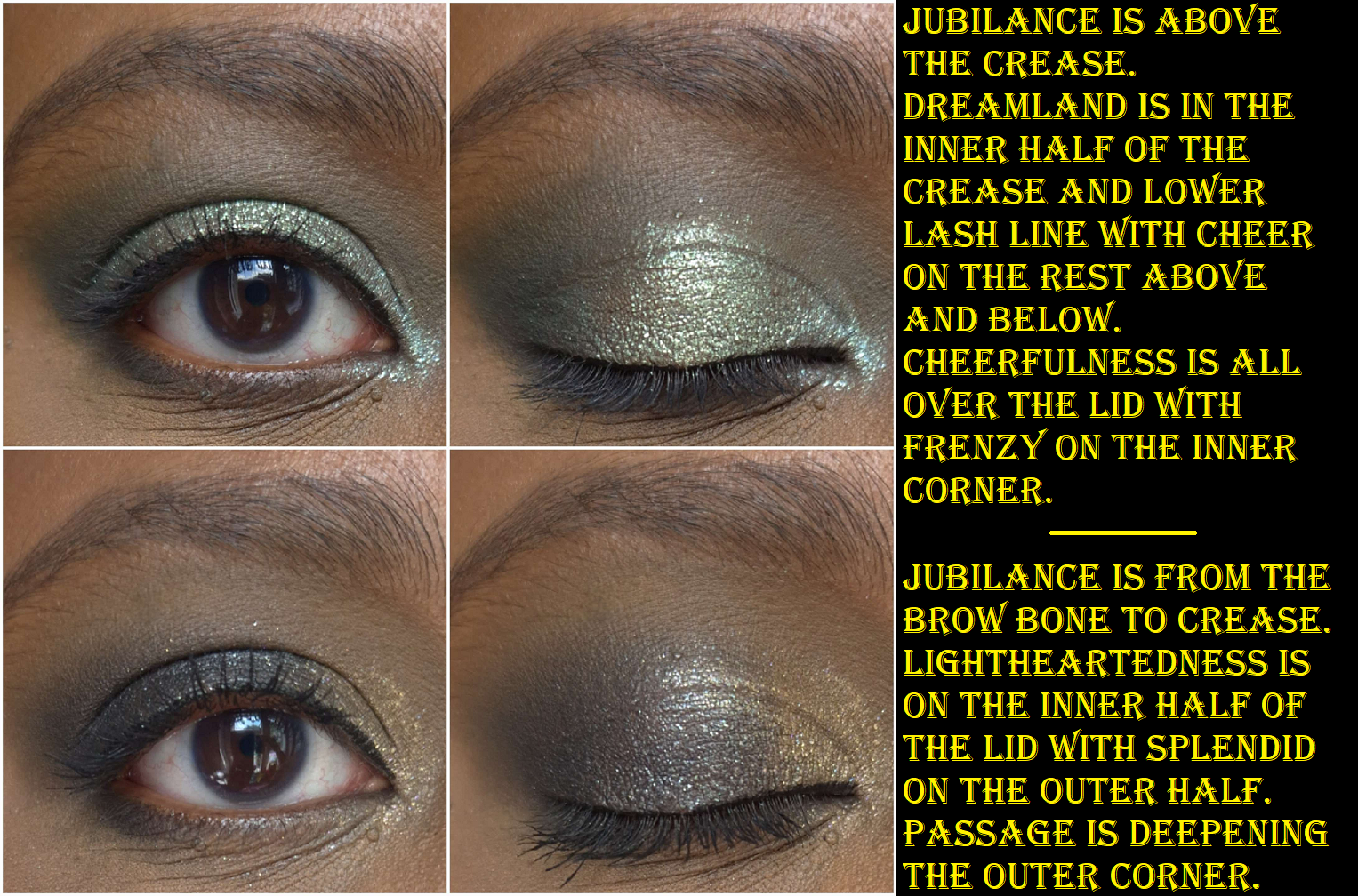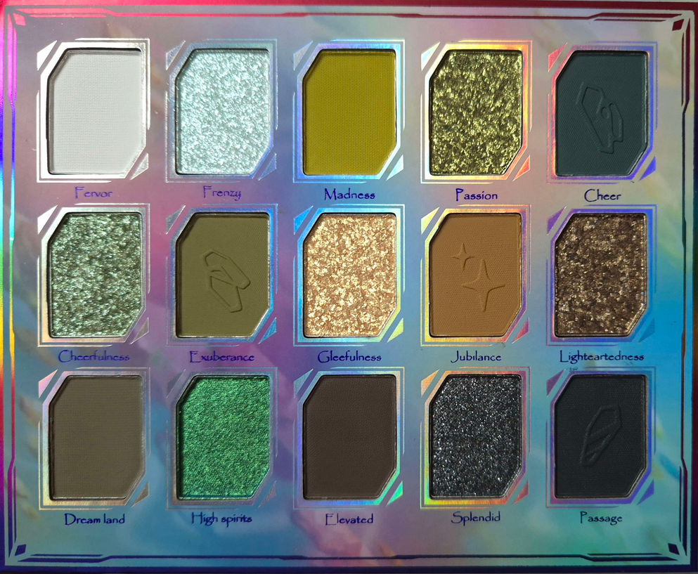 Madness, Exuberance, and High Spirits are right up my alley. I still have to build up Madness quite a bit for it to be visible though. Cheer, Dreamland, and Frenzy make a nice combination as they share a blue undertone, but as I mentioned countless times that isn’t my preference. Frenzy needed to be applied damp in order to get on my eyes smoothly, and Cheer is a dark blue-green that’s easy to blend unlike Outsider from the Norn’s palette. Jubilance is pretty, but blends in too much with my skin tone. Gleefulness is beautiful in tone, but it’s not my favorite to use because it’s so flaky (and strangely wet feeling in the pan compared to the other shimmers). Passion is slightly smoother, but still a little flaky. Cheerfulness looks light green in the pan, but the tone is more blue than I expected! It’s a smooth shimmer, but with some shimmer particles that are randomly bigger than the others. I didn’t need to apply Cheerfulness or Lightheartedness damp, nor High Spirits which was bound to be different since it’s a multichrome. High Spirits is truly smooth in texture and reminds me of Clionadh’s Jeweled Lite multichromes (based on photos online). Splendid is more like a traditional shimmer. It’s not as fine in shimmer as High Spirits, but it’s not flaky like most of the others.