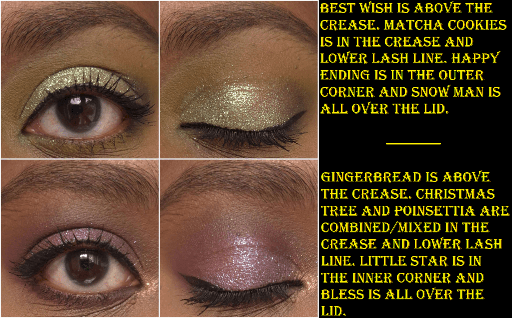 Looking at the state of my palette, it’s clear that I reach for specific shades mainly: the entire first row, Snow Man, Best Wish, Little Star, Gingerbread, Happy Ending, and Santa Star. The greens, duochromes, and neutrals in here allow me to create some of my all time favorite looks. Colors like Best Wish aren’t prevalent in my collection, so I have some unique options, and the palette layout’s color combinations inspire me. In addition, this is the brand’s best quality with no duds. The number of times the brand had to bring this and the Christmas Eve palette back is a testament to how good they are and why they’re so sought after.